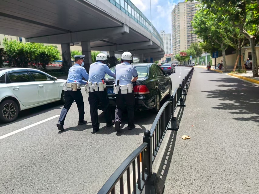 另一起抛锚事故发生在日前的一个下午。在中山南二路、宛平路口东南侧,一辆SUV汽车抛锚停在路中,正在执勤的徐汇交管支队辅警立即呼叫增援力量,共同帮助司机将车推至不影响交通的地方等待拖车。